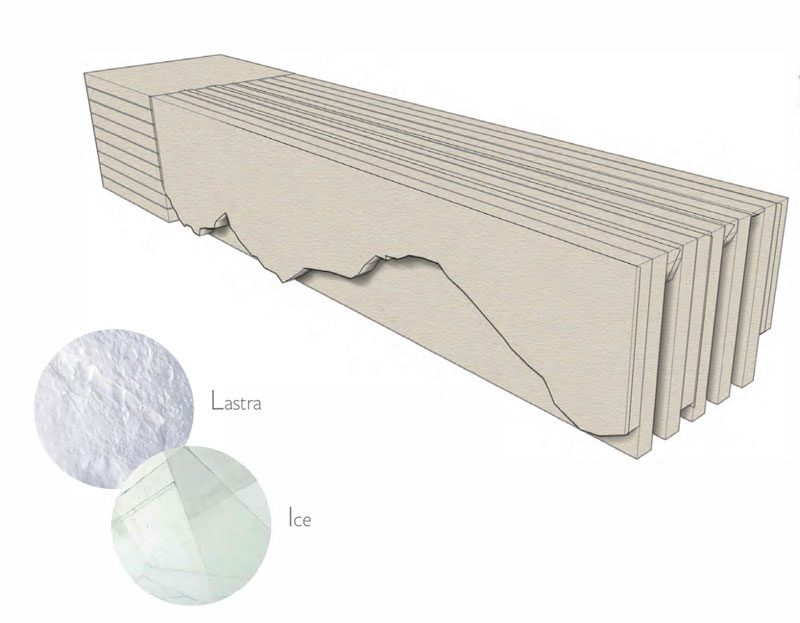Using Berman’s signature cast glass textures, renowned for their elegant abstraction of surfaces found within nature, and a true artisanal approach to architectural sculptures; a clear narrative of formation and erosion is told.